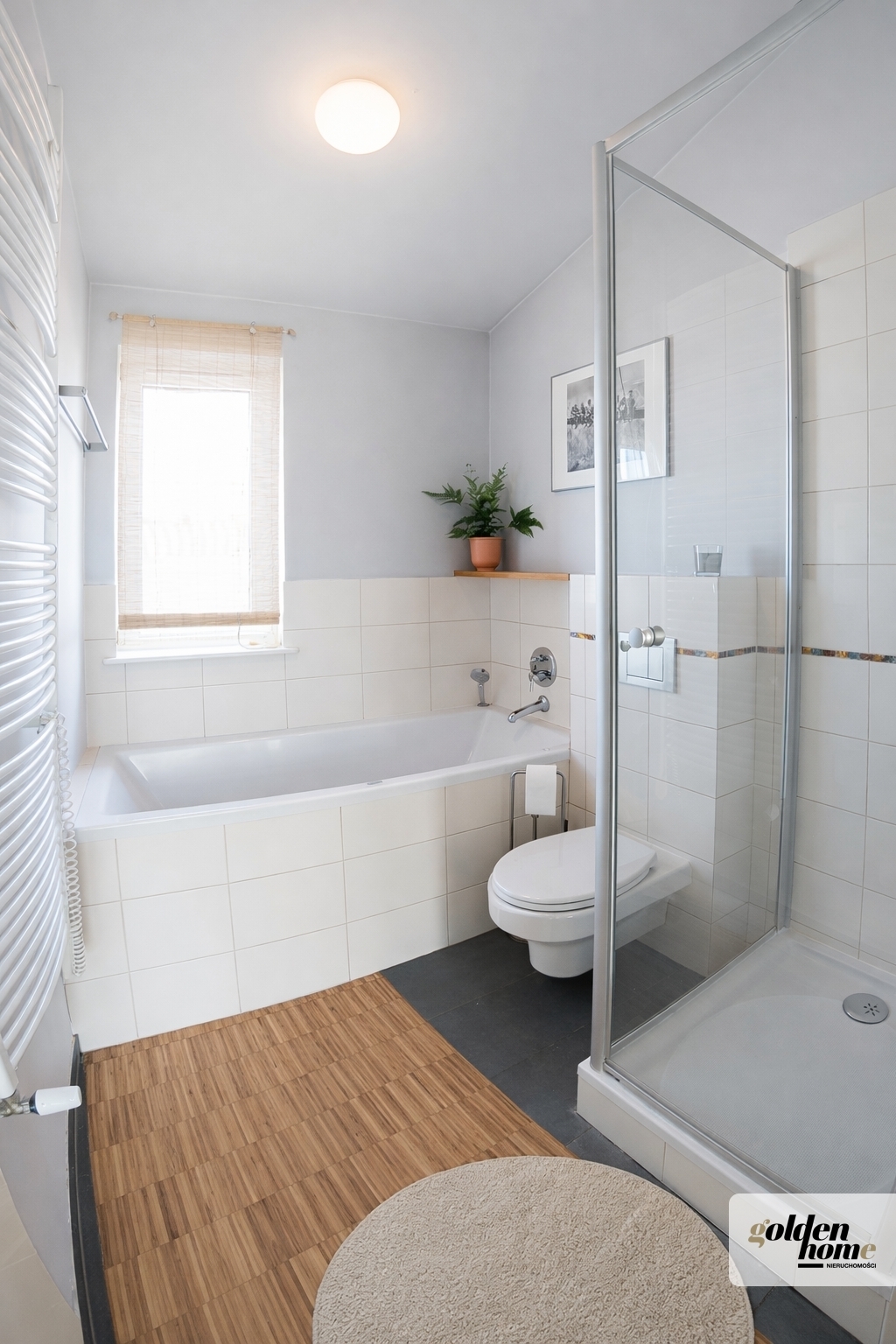 Na oknach zamontowane są rolety rzymskie. W pokojach znajduje się dębowy parkiet przemysłowy, olejowany, który można wielokrotnie cyklinować. W kuchni oraz łazience położono płytki.
