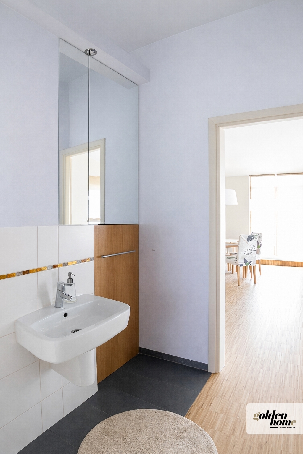 W łazience znajduje się zarówno wanna, jak i prysznic, a także pralka, duże lustra, zlew oraz zabudowa meblowa.